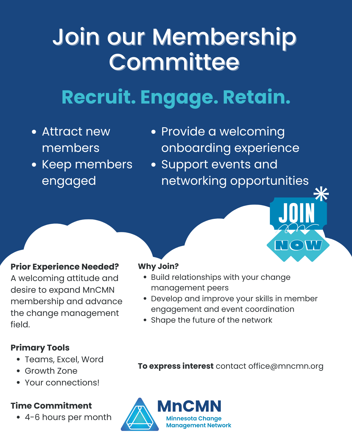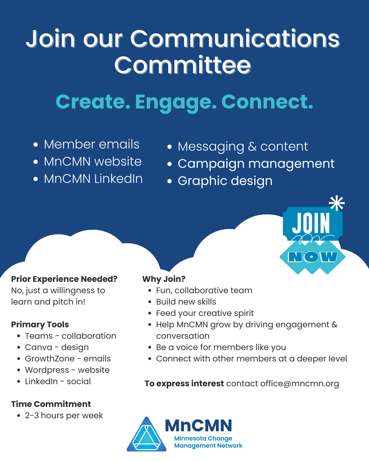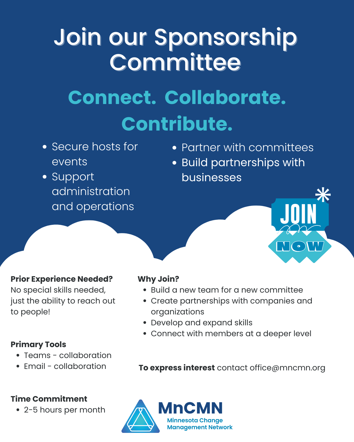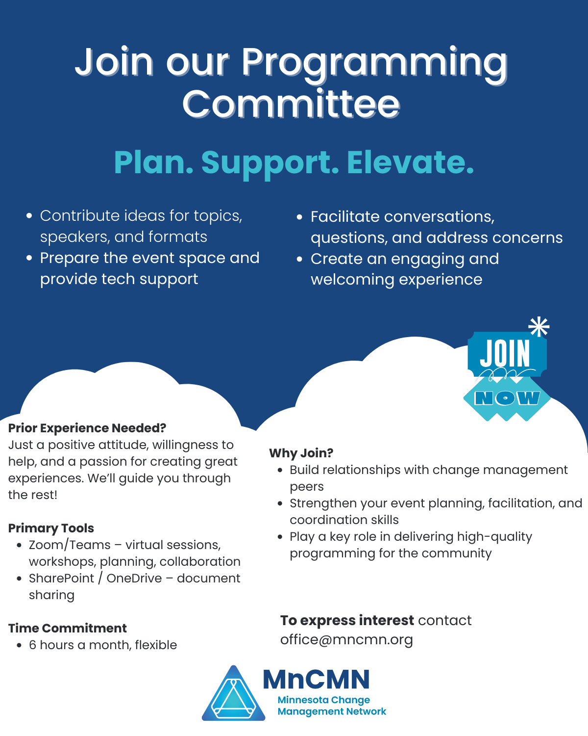 The Minnesota Change Management Network moves forward because people like you step up. We want your voice and ideas to continue to shape our organization.
